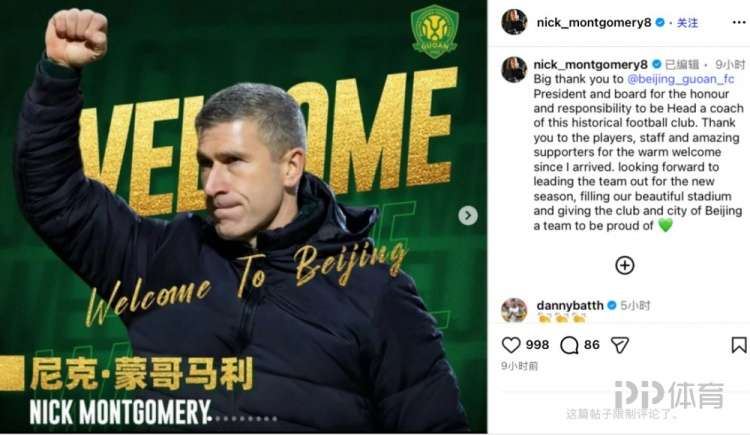 昨晚,国安新帅蒙哥马利更新社媒,向国安俱乐部以及球迷致谢,并对新赛季进行展望。