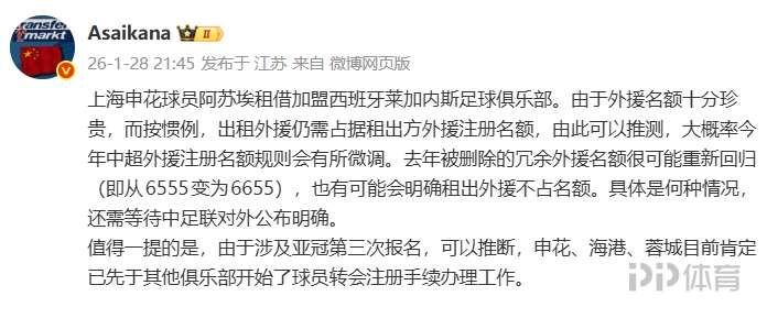 申花今日官宣外租外援阿苏埃至莱加内斯。德转中国区管理员朱艺谈到了新赛季的外援注册政策。