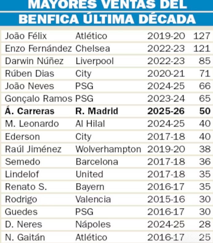 其中不乏高价转会案例,菲利克斯以1.27亿欧元加盟马竞,恩佐-费尔南德斯以1.21亿欧元转会切尔西。此外还有众多球员登上转会榜单,出身皇马青训、以5000万欧元转会的阿尔瓦罗-卡雷拉斯位列俱乐部转会收入榜第七位。